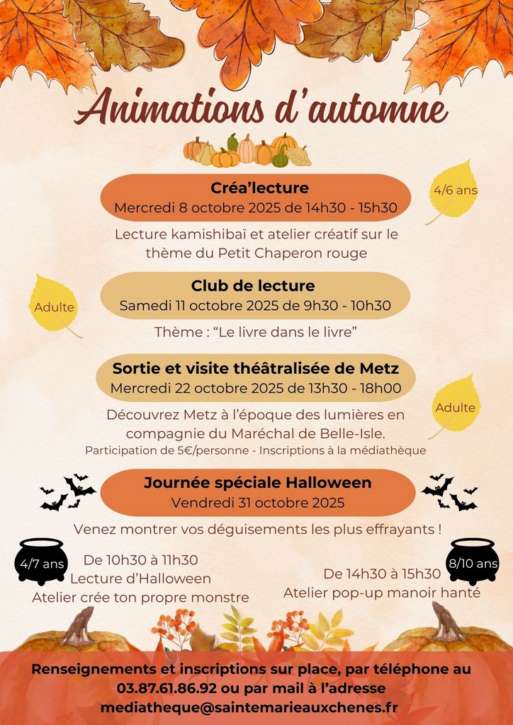 Inscriptions sur place, par téléphone au 03.87.61.86.92 ou par mail : mediatheque@saintemarieauxchenes.fr