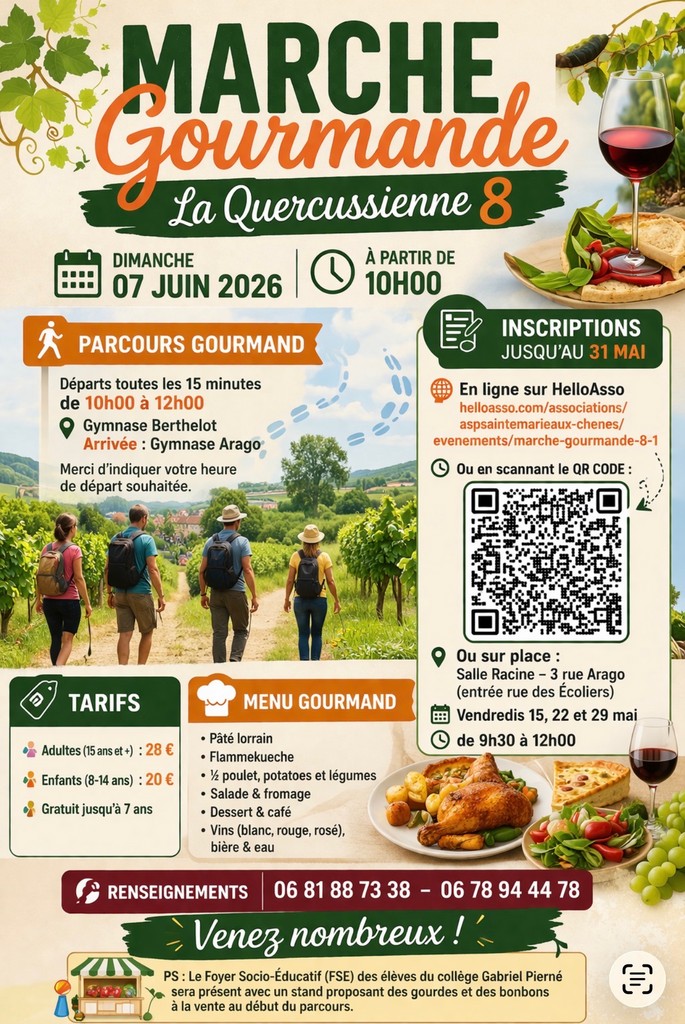 Inscriptions: permanence salle Racine, 3 rue Arago (rez-de-chaussée, Médiathèque) les vendredis 15, 22 et 29 mai 2026 de 9h30 à 12h ou dès maintenant : https://www.helloasso.com/associations/aspsaintemarieaux-chenes/evenements/marche-gourmande-8-1